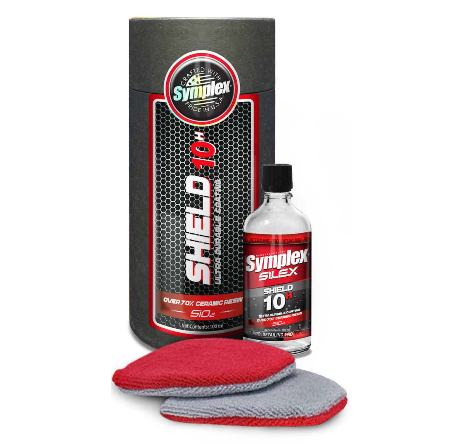Silex® Shield 10H, revestimiento cerámico ultra duradero, nuestra última fórmula de Sio2 más concentrada. El Shield 10H contiene más de un 70% de resinas cerámicas. Meticulosamente diseñado para el detallista profesional. Esta fórmula única ultra concentrada de Si02 dejará una capa transparente gruesa y duradera como un espejo con una dureza extrema de 10H y una excelente resistencia hidrofóbica, a la detergencia y a los ácidos. Protección cerámica Symplex® Shield 10H Contiene la última tecnología SiO2